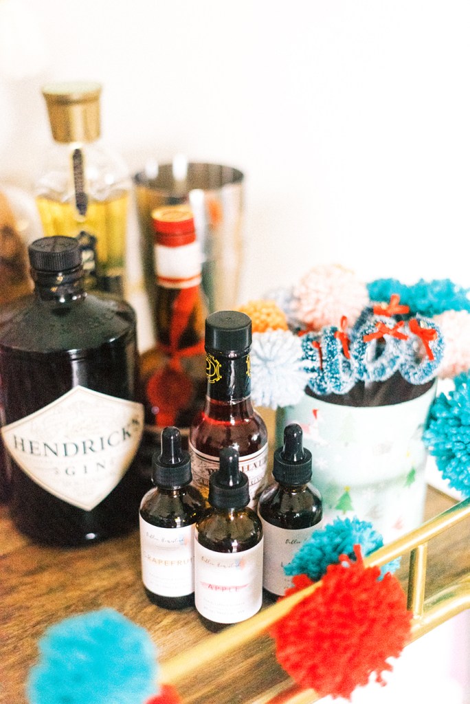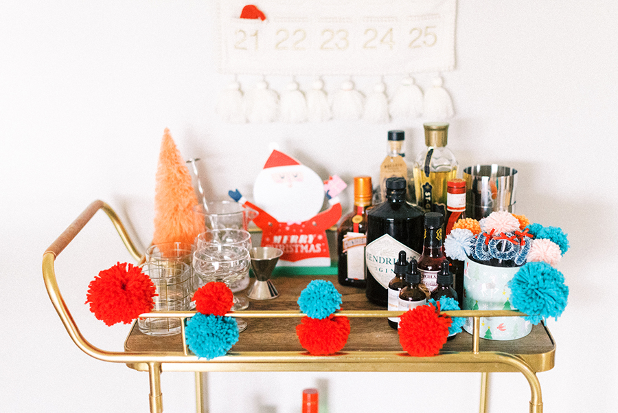To add the Christmas touch to my bar cart, I attached handmade pom poms to the front bar. If you don’t already have a pom pom maker, you should definitely get one! Pom poms are so easy to make and I’ve been added them to everything lately. Speaking of pom poms, I added my pom pom and Christmas wreath drink stirrers to my cart and I just love how cute they are! I also added my favorite cheap finds from Hobby Lobby and Target; colorful bottle brush trees and a vintage looking Santa from Target’s One Spot! Overall, I wanted to add a little Holiday spirit to my bar cart without over doing it so I’m thrilled how it turned out!